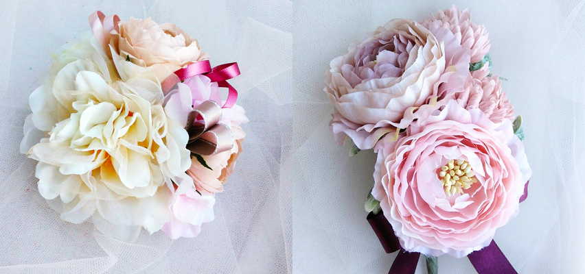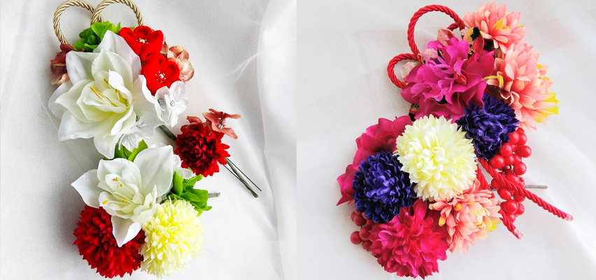 オリジナル・ハンドメイドの髪飾りはアートフラワー(造花)製でとても軽く、長時間の着用でも大丈夫。多様な色、形、大きさのものをご用意しております。